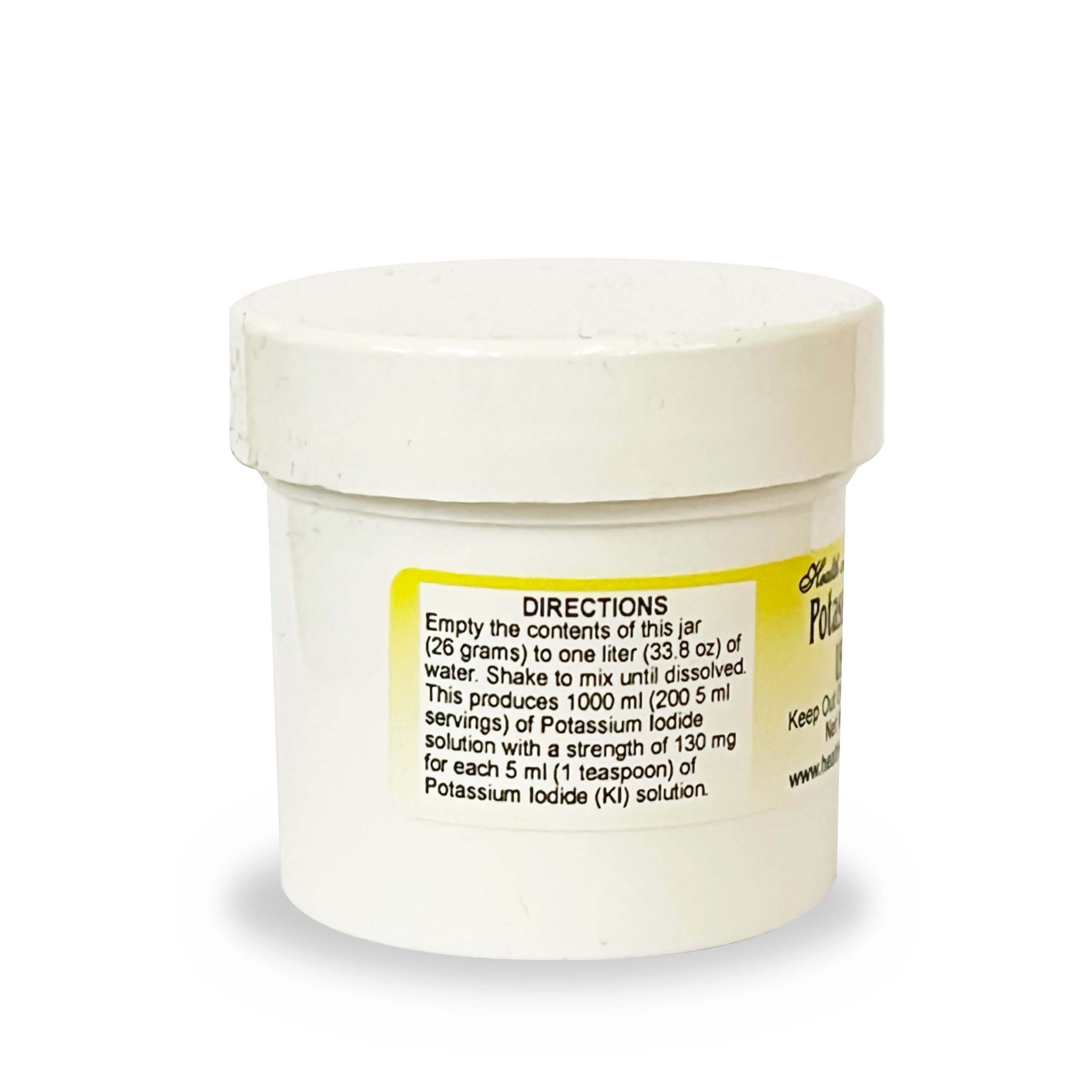 26 Gram unit (200 adult doses) – Empty the contents of the 26 gram container (1 level Tablespoon) of Health And Wisdom’s Potassium Iodide USP into 1 LITER (33.8 ounces) of water. Mix to dissolve.